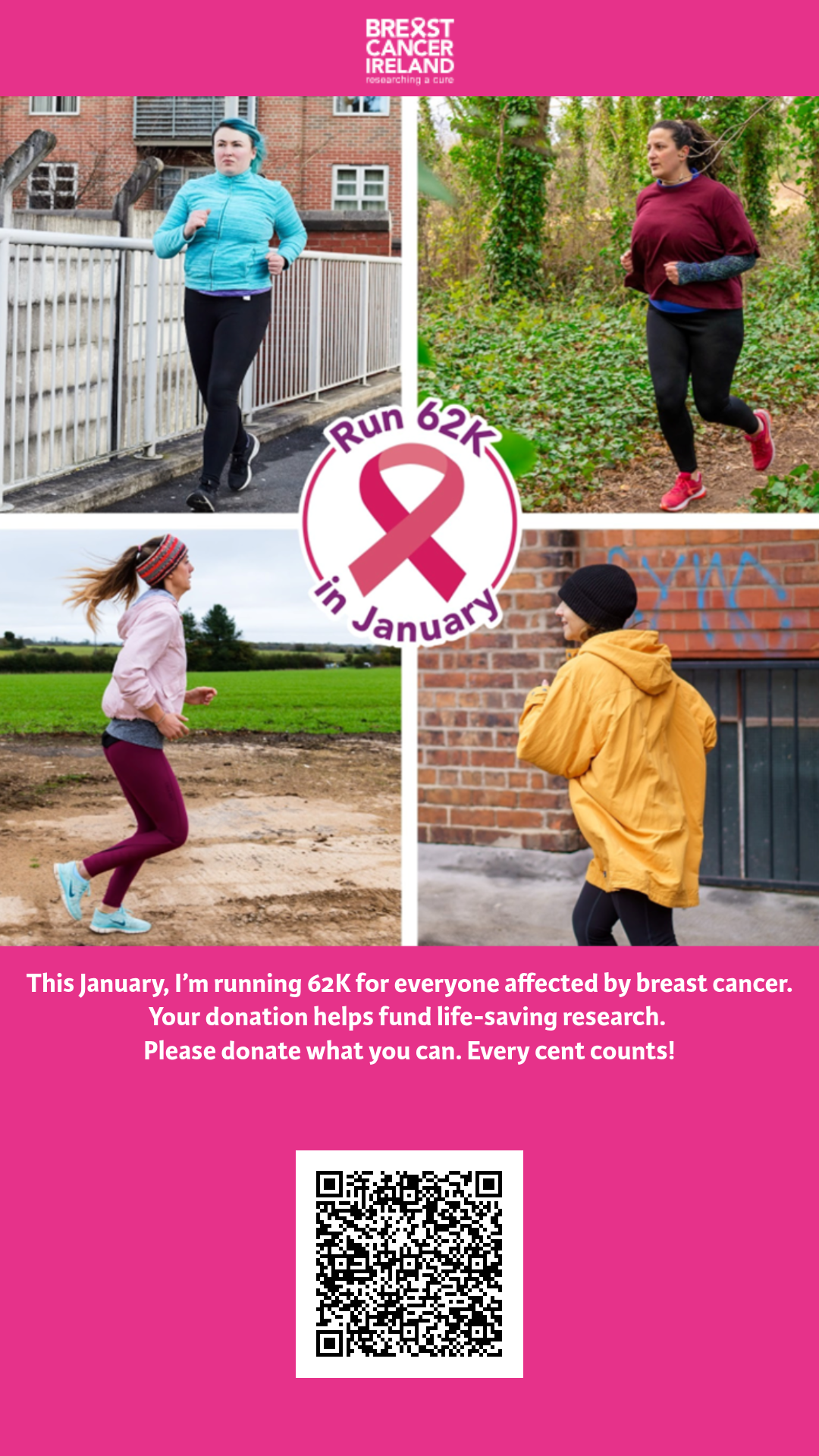 The challenge is simple: Run 62k throughout the month of January to raise funds and awareness for life-saving breast cancer research and education.